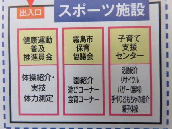 第2会場は国分シビックセンターで、9時30分から健康・福祉コーナーが開設されます。公民館の2階のスポーツ施設で、市の子育て支援センター会がバザー(無料)や手作りおもちゃの紹介などを行いますので、ぜひご来場ください。